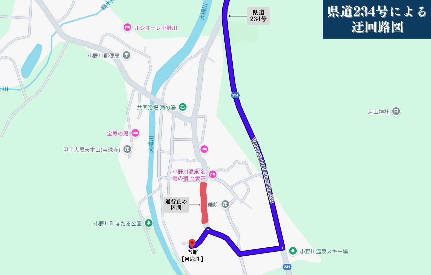 当館へお越しの際、小野川温泉入口から県道234号への迂回をお願い致します。